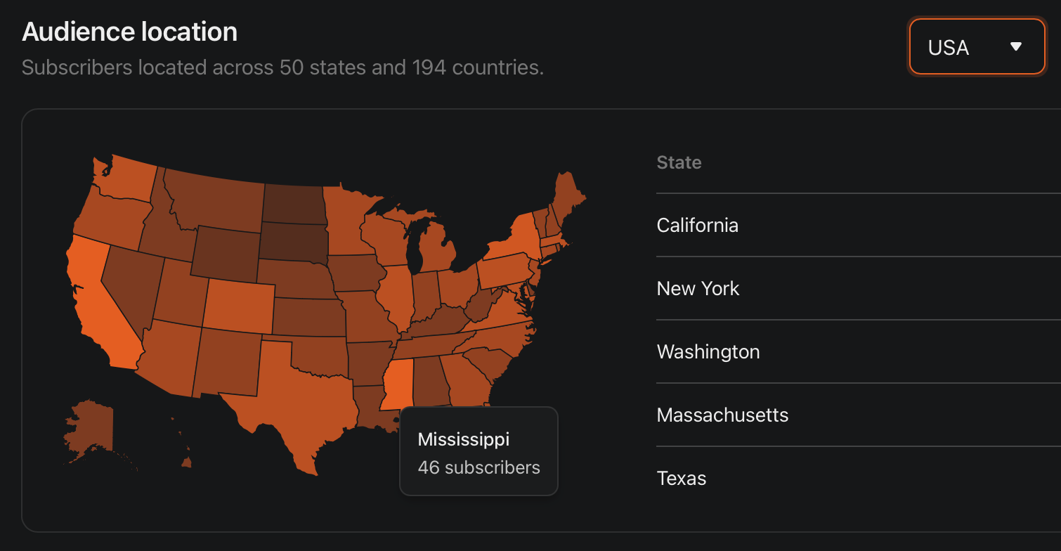 Over the past five years, Twitter is the predominant way that people have shared and discovered Volts (outside of direct search via Google and Substack), which makes sense given that David was a long-time power user of the platform. He has since absconded to Bluesky, which now takes the top spot. Notably, Hacker News is our second biggest referrer these days. We’re barely registering traffic via ChatGPT; thanks for nothing, robots.