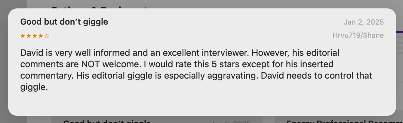 If I’m having a bad day, I like to go to the Volts unsubscribe feedback page to remind myself that David and every podcaster have it worse. I don’t think he reads the unsubscribe mesages, but if he did, he’d be utterly confused. He’s too liberal and he’s too critical of liberals. He’s too wonky and he only asks softball questions. A recent favorite: “I thought your interview was a perfect teasing out of why your smug insufferability is not just annoying, but unhelpful at this point.” Do tell us how you really feel 😂.