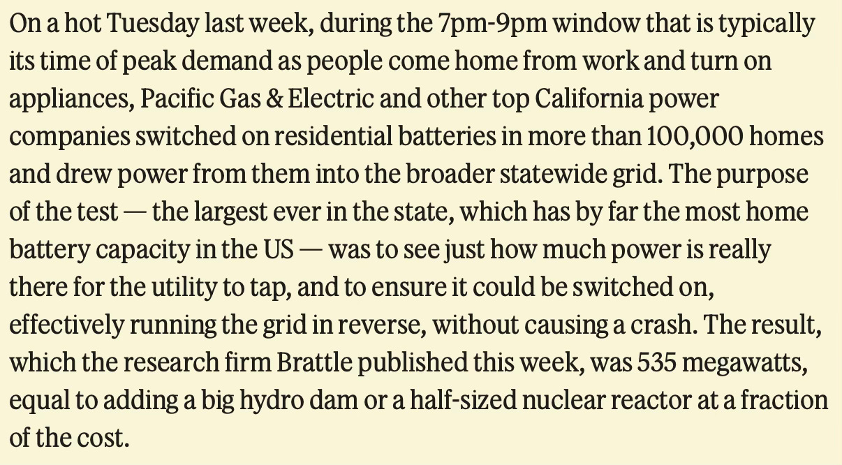In my July conversation with PG&E’s Quinn Nakayama, we only briefly touched on virtual power plants (VPPs), but I’m glad to share the following report, relayed by Semafor, regarding a test of California’s residential battery capacity: