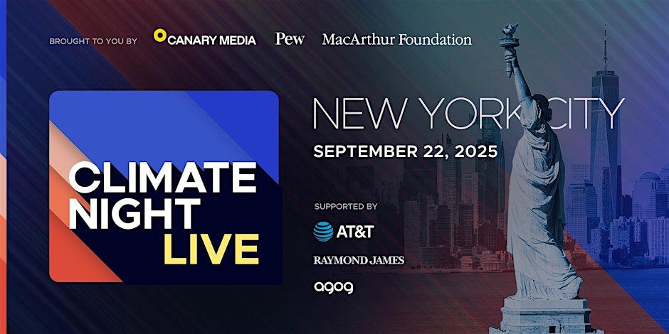 1. 🎫 In September, I will be attending Climate Week NYC and participating in a few events. I’m doing two shows with Canary Media. The first is their Climate Night Live at Climate Week NYC on Sept 22nd (5 - 10pm), where I will be interviewing … someone on stage (stay tuned.)