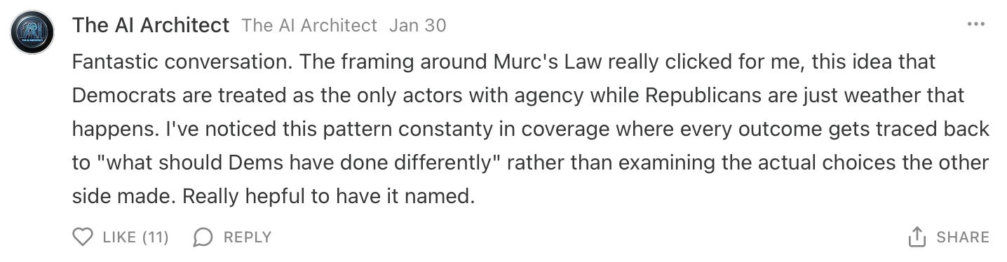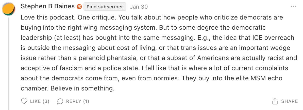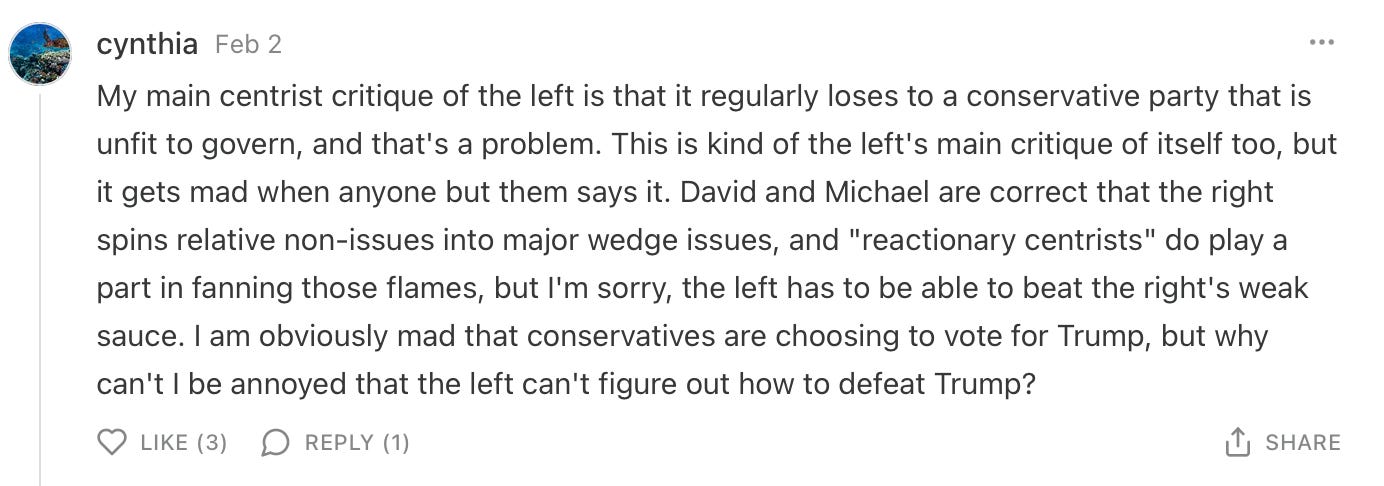6. ✅ I confess I was a little worried about how the reactionary-centrism episode would land, but by and large, feedback has been positive and the comments section has been quite lively! Some comments of the month: