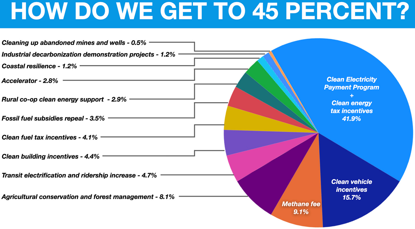 As Schumer’s graph shows, the Clean Electricity Payment Program, in combination with the extension and expansion of the clean-energy tax credits, would be responsible for almost 42 percent of the bill’s total reductions.